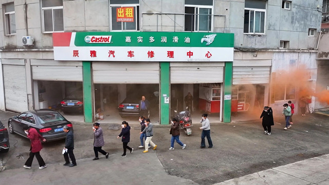 安全引导员组织居民用湿毛巾捂口鼻,弯腰低姿沿安全通道有序撤离。楼道内烟雾弥漫,引导员们高声提醒,居民沉着应对。几分钟内,居民全体安全撤离至集结区。此时,消防车驶入,消防员迅速铺水带“灭火”,尽显专业救援快速响应力。