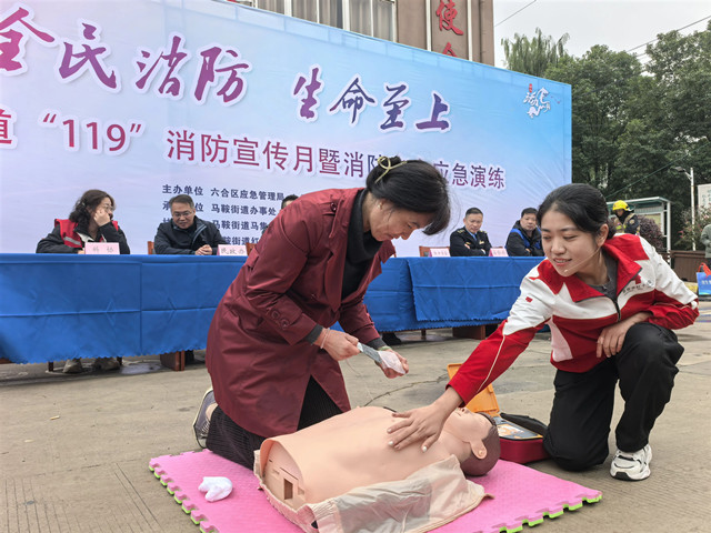 六合区红十字会志愿者示范心肺复苏、AED等急救操作,讲解火灾常见伤害处理法,居民们认真观看,不少人主动实操。