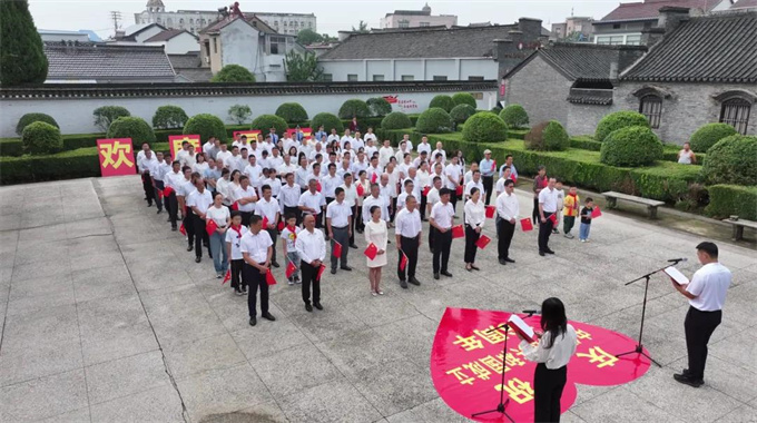升旗仪式后,一场充满乡土情怀与红色记忆的诗歌朗诵接续上演。竹镇儿女代表身着正装,声情并茂地朗诵了原创诗歌《我骄傲,我是竹镇人》。诗句里,既有“六朝烟水绕竹镇”的文化底蕴,更有“红色基因永传承”的精神力量。回望竹镇烽火岁月,真挚的情感、铿锵的语调,不仅抒发了竹镇人民对家乡的无限挚爱与自豪,随后,熟悉的《我和我的祖国》旋律响起,全体人员举起手中的国旗,跟着旋律齐声高唱。“我和我的祖国,一刻也不能分割,无论我走到哪里,都流出一首赞歌……”悠扬的歌声随风飘荡,一张张饱含深情的脸庞、一面面挥动的国旗,汇聚成一片红色的海洋。歌声是竹镇人民对祖国最直白的深情告白,更是全体竹镇人团结一心、砥砺前行,共筑美好未来的共同心声。更表达了对未来美好生活的憧憬,引发了现场所有人的共鸣。